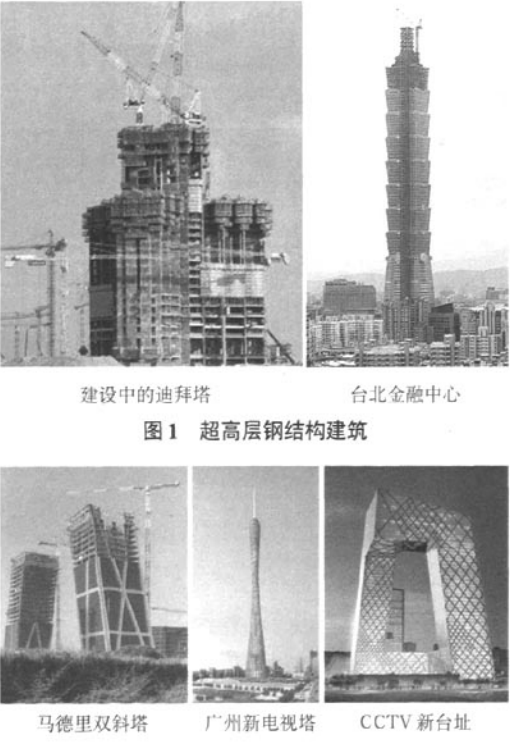 超高層建筑是人類征服自然,不斷取得進(jìn)步的重要標(biāo)志,是現(xiàn)代科學(xué)技術(shù)發(fā)展的結(jié)晶,也是一個(gè)國家科技發(fā)展水平和綜合實(shí)力的集中體現(xiàn)之一。因此無論是發(fā)達(dá)國家,還是發(fā)展中國家都把興建超高層建筑作為展示社會(huì)發(fā)展成就的重要手段。而超高層建筑通常采用鋼結(jié)構(gòu)作為主要構(gòu)成部分,因此超高層建筑一般都是超高層鋼結(jié)構(gòu)。現(xiàn)代超高層建筑起源于美國,已有110年的發(fā)展歷史,超高層建筑的興建不但具有顯著的經(jīng)濟(jì)效益和社會(huì)效益,能夠展現(xiàn)一個(gè)時(shí)代、~個(gè)國家的科技發(fā)展成就,而且可以極大地促進(jìn)相關(guān)領(lǐng)域科技的發(fā)展。因此目前興起了超高層建筑建設(shè)的新高潮。不僅高度越來越高,如高達(dá)492m的上海環(huán)球金融中心,508m的臺(tái)北國際金融中心,阿聯(lián)酋超過700m高的Burj Dubai大廈(迪拜塔),圖l。而且超高層建筑造型也更加多樣化,扭轉(zhuǎn)的廣州新電視塔和傾斜的中央電視臺(tái)新臺(tái)址建設(shè)工程就是其中典型的代表。