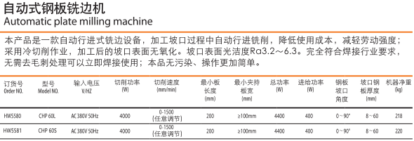 本產品是一款自動行進式銑邊設備,加工坡口過程中自動行進銑削,降低使用成本,減輕勞動強度:采用冷切削作業,加工后的坡口表面無氧化。坡口表面光潔度Ra3.2—6.3.完全符合焊接行業要求,無需去毛刺處理可以立即焊接使用:本品無污染,操作更加簡單。