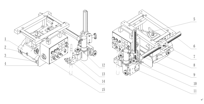 14. 焊槍夾持器總成:是焊槍的夾持裝置,可以方便地進行維修、調整和焊槍的拆卸。