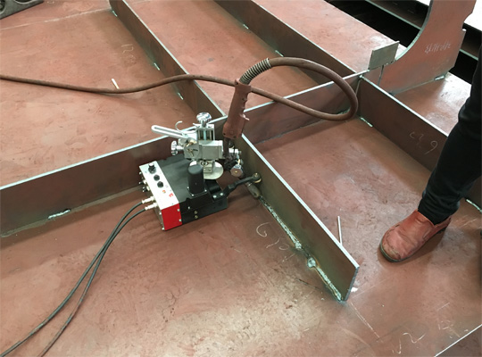 本裝置的左側裝有感應式傳感器,當機器行走過程中,傳感器感應到金屬物品時,機器會自動停止,并根據機器的設置自動執行后面的操作(如盲區焊接、收弧、熄弧、復位等動作)。因此一人可同時操作多臺本焊接小車,以提高工作效率。本裝置有三種盲區焊接模式供用戶選擇,可選擇焊槍自動移動到小車的中部、另一側或不動進行焊接;焊接至工件端部時,傳感器自動控制焊槍的輔助行走,執行盲區的焊接。盲區焊接時的焊槍移動速度與小車行走時的焊接速度基本一致,從而不影響焊接質量。