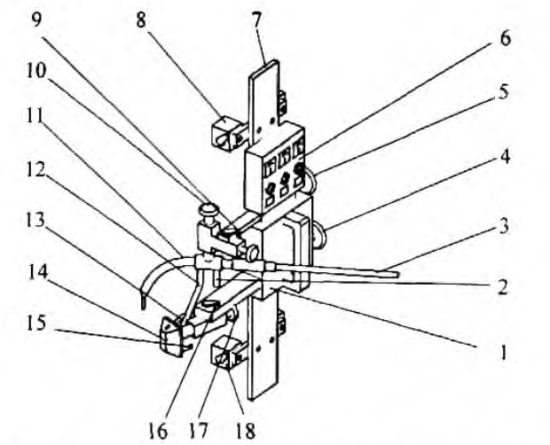 1一車體;2一水冷電纜;3一送絲管;4一手柄;5一于柄;6一操作盒;7一軌道;8一手柄;9一鎖緊扳把;10一手柄;11一水冷焊槍;12一水管;13一C02氣管;14水冷滑塊;15一回水管;l仁鎖緊扳把;17-于柄;18一磁鐵。