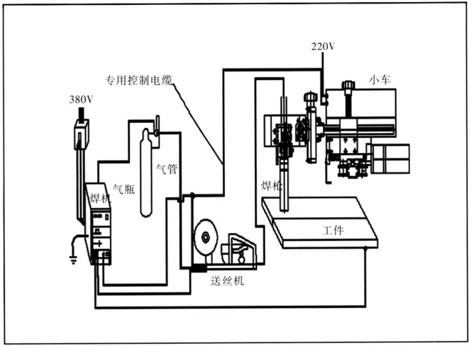 全位置自動焊接小車是一種半自動焊接設備,由小車本體、驅動裝置、控制裝置、焊槍夾持裝置組成。人工輸入工藝參數后,能夠按照一定運行軌跡實現全方位自動焊接。全位置自動焊接小車在10年前由國外(韓國、德國)引進,目前該技術已經逐步國產化,并有部分企業開始生產該產品。該自動焊接裝置投資少,重量只有10kg左右,可隨‘丁件移動,只需與T廠現有的氣體保護焊機和220V電源簡單連接即可操作(如圖1)。操作門檻低,工人只需稍有焊接基礎,簡單培訓后即可上崗操作。全位置自動焊接小車有兩種行走方式,一種是沿專用軌道行走,軌道靠專用磁鐵或吸盤吸附在被焊接『[件上,采用齒輪齒條方式驅動。軌道有剛性軌道和柔性軌道兩種,剛性軌道走直線,實現平直或豎直焊縫自動焊接;柔性軌道可以隨工件焊縫彎曲,實現環形焊縫自動焊接。另一種是采用磁輪行走機構,小車靠強磁車輪吸附于工件表面,用導向輪定位,沿著焊縫行走,可以實現直線和曲線自動焊接。全位置自動焊接小車一般設有一個或兩個焊槍夾持裝置,用來夾持普通氣體保護焊機的焊槍。焊槍夾持裝置設有專用直線往返式擺動裝置,用數字方式調節擺動幅度、中心位置的移動、左停止時間、右停止時間及擺動速度,并具有停止焊接時焊槍自動停止在中心回位的功能。自動焊接擺動小車,與手工焊接相比,焊接幾乎不受焊工技術水平的影響;焊接過程穩定,缺陷少,焊縫表面清潔,焊接質量提高;焊接過程中,焊絲可以連續送進,熔敷速度快,減少了焊工換焊條或變換姿勢或休息的時間,大大提高了生產率;可進行一次性長距離焊接,焊接過程飛濺小,煙塵少,可以一人操作兩臺設備,大大降低了工人的勞動強度。